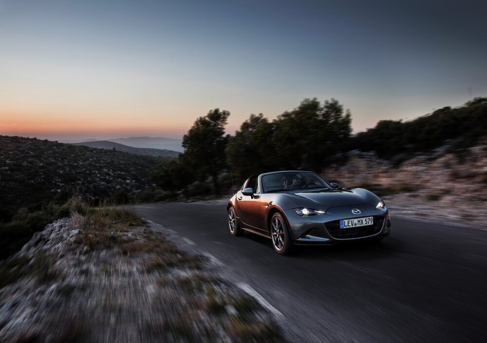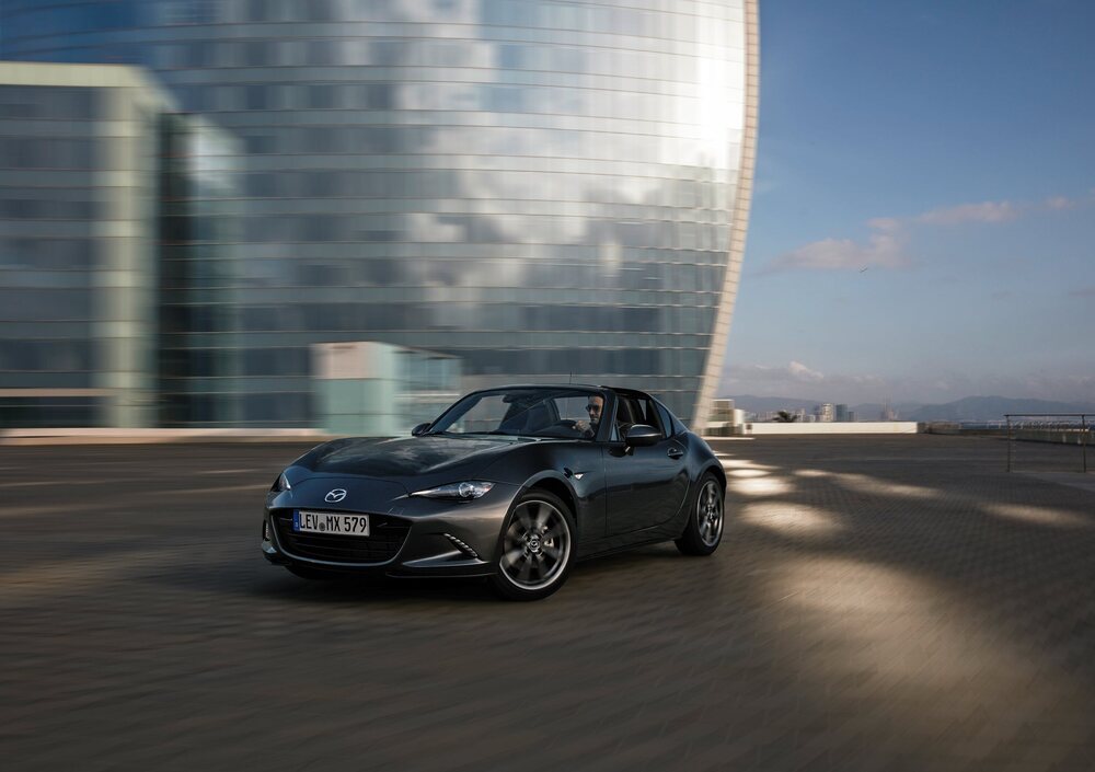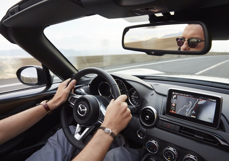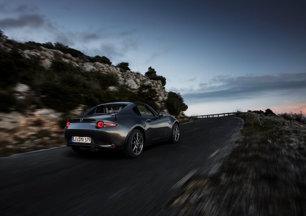 Al suo interno, la MX-5 RF presenta la medesima tecnologia audio e la stessa connettività del modello con la capote in tela. A disposizione degli occupanti c’è quindi un sistema audio Bose con 9 altoparlanti e con amplificatori nei poggiatesta (di serie sull’allestimento Exceed e Sport), il sistema MZD Connect, che consente, fra le altre, di fornire connettività alla vettura, lo schermo da 7 pollici, con funzioni infotainment controllabili attraverso il manettino posto al centro del tunnel o per il tramite di comandi vocali. Decisamente completi sono anche i sistemi di sicurezza, riuniti da Mazda sotto il nome di i-Activesense che comprendono: il sistema di monitoraggio dei punti ciechi (Blind Spot Monitoring) mediante radar a 24 GHz, il Rear Cross Traffic Alert, che segnala veicoli in avvicinamento nelle fasi di retromarcia, il Machine Grey, la stessa lanciata recentemente in Europa sulla Mazda6 di ultima generazione e realizzata con una tecnica di verniciatura chiamata Takuminuri, che prevede una finitura in tre strati (trasparente, riflettente e colorata), attraverso la quale è possibile ottenere una struttura metallica unica grazie alla presenza di scaglie di alluminio nello strato riflettente ultrasottile. La parte superiore del tetto, può essere ordinata sia nella stessa colorazione della carrozzeria, che in colore nero lucido.(AFS), che segue le curve della strada e orienta gli anabbaglianti nella direzione prevista del veicolo. Decisamente buoni i materiali scelti per l’abitacolo, con plastiche di buona fattura e finiture in alluminio, in grado di segnare più di un punto a favore di Mazda nel confronto – per il vero non particolarmente gradito agli uomini della casa giapponese – con quella che ci pare una delle più concrete competitor della MX-5: la Toyota GT86. Tra le chicche riservate alla nuova RF, segnaliamo la colorazione sistema di fari adattativi (High Beam Control), che utilizza una telecamera per monitorare fari anteriori e posteriori dei veicoli che precedono, passando automaticamente da abbaglianti ad anabbaglianti, onde evitare di accecare gli altri automobilisti, e il sistema controllo abbaglianti (sistema di segnalazione cambio involontario di corsia), il Lane Departure Warning System