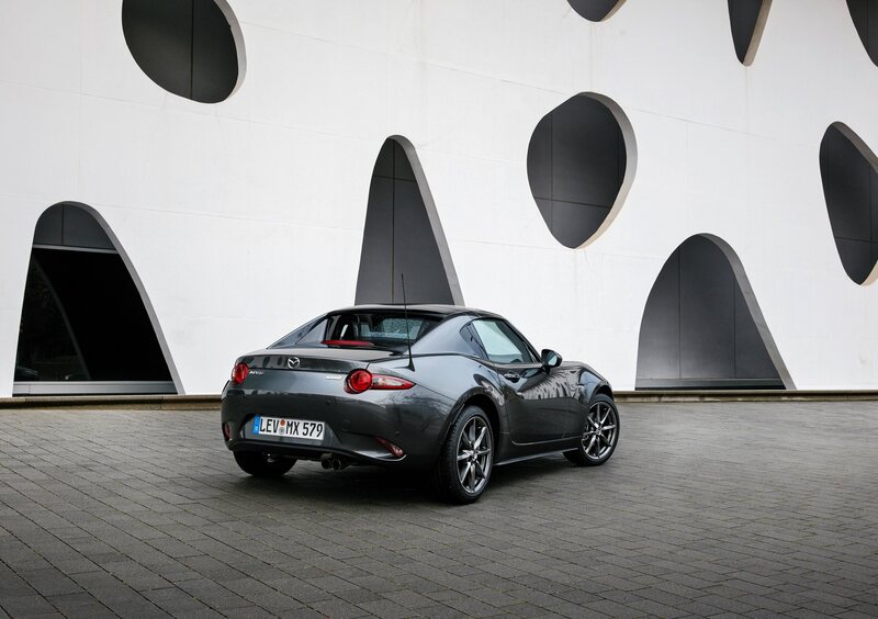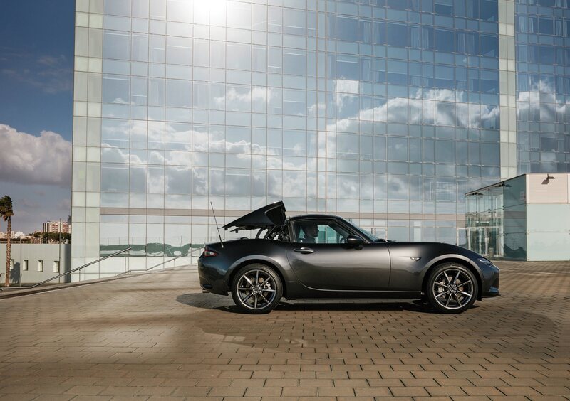 Dopo il lancio della quarta generazione della MX-5, l’intento manifestato da Mazda è stato quello di poter commercializzare una vettura che non alterasse le qualità dinamiche della Roadster, offrendo, al contempo, tutti i vantaggi di un’auto dal tetto rigido e senza intaccare, in alcun modo, le (già risicate) capacità di carico della piccola spider. Gli ingegneri nipponici hanno, così, deciso di abbandonare l’idea che il tetto rigido debba sparire completamente all’interno della vettura, dando forma a quella che – una volta chiusa – a Mazda sembra soprattutto una fastback (coda corta e lunotto molto spiovente) ma che a noi ricorda, in particolar modo, una vettura targa. Una definizione per il vero impropria, posto che, di fatto, la struttura installata dai tecnici di Hiroshima non aggiunge un vero e proprio montante, alle spalle di guidatore e passeggero. Il tetto rigido realizzato dalla casa nipponica è costituito, infatti, da tre parti, realizzate in tre differenti materiali: alluminio per quella anteriore, acciaio per il centro e laminato plastico composito (SMC) per il gruppo posteriore. Una volta azionato, il meccanismo di chiusura (per altro, esattamente lo stesso adoperato per la Mazda MX-5 RC) ripone la porzione anteriore e centrale del tetto, assieme al lunotto posteriore, in un apposito alloggiamento, senza ridurre la capienza del bagagliaio (che, lo ricordiamo, è pari a 130 litri) con la sezione posteriore che rimane invece al suo posto.