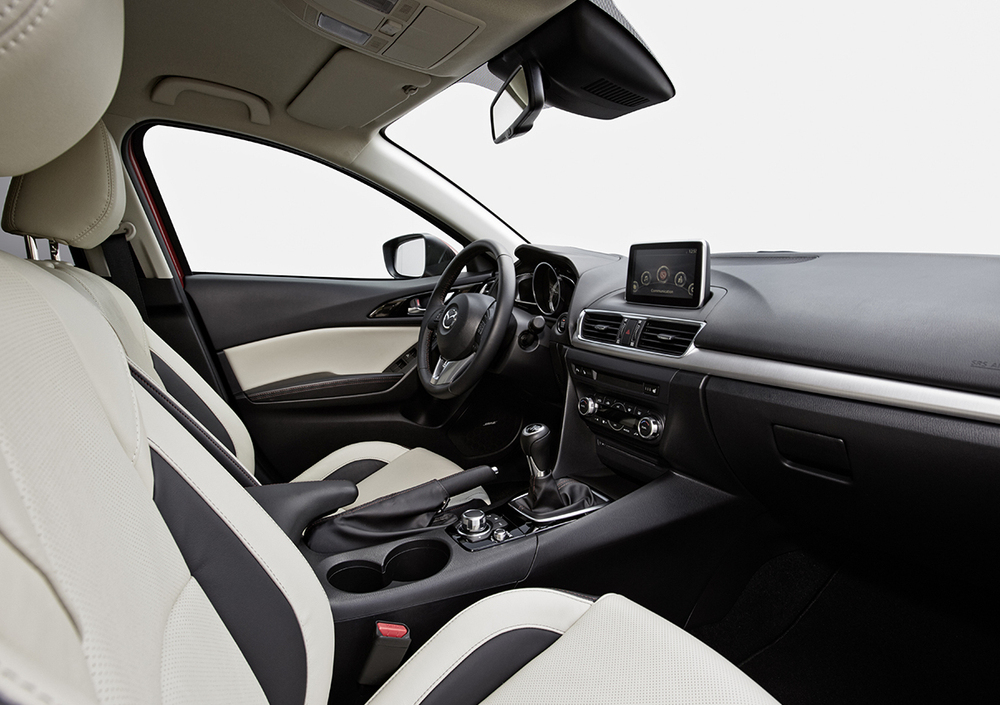 L’abitacolo mette subito a proprio agio grazie alle buone possibilità di regolazione del sedile (elettriche sul nostro esemplare), ma soprattutto per la qualità dei materiali. Le plastiche sono morbide, così come la pelle, di gran qualità e gli assemblaggi sono rigorosi e solidi. Non manca niente dal punto di vista della tecnologia, grazie al sistema multimediale Mazda Connect con display in stile tablet e ad un pacchetto completo di sistemi di assistenza alla guida, che comprende anche il praticissimo cruise control attivo. Accattivante la strumentazione in stile “motociclistico”, con il grande contagiri analogico centrale. Il design particolarmente estroverso della coda, se da un lato rende molto originale la zona posteriore dall’altro deve fare i conti con un’abitabilità non al top. Dietro il divieto accoglie comodamente due passeggeri, ma lo spazio per gambe e testa non è infinito. Stesso discorso per il bagagliaio, che si ferma ad una capacità di carico di 364 litri (la VW Golf ne offre 308, la Peugeot 308 420).