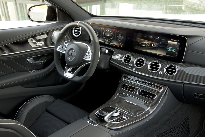 Comoda per quattro persone, la nuova Classe E 63 AMG vanta interni in cui non manca nulla, nemmeno dei sedili sportivi che sembrano essere presi direttamente dal mondo delle corse. Una cura per il dettaglio davvero maniacale combinata a materiali di elevatissima qualità, sia per quanto riguarda le finiture in alluminio e fibra di carbonio che per quanto concerne le plastiche ed i pellami utilizzati per i rivestimenti. Un abitacolo estremamente lussuoso, pensato per assicurare un giusto compromesso tra sportività e confort di bordo grazie anche alla presenza di due schermi hd posti affiancati: uno svolge il ruolo di strumentazione, l'altro quello di interfaccia con il sistema multimediale Comand Online di ultima generazione. Un sistema ricco di informazioni, dotato di un'interfaccia non del tutto intuitiva ma comunque molto completa.