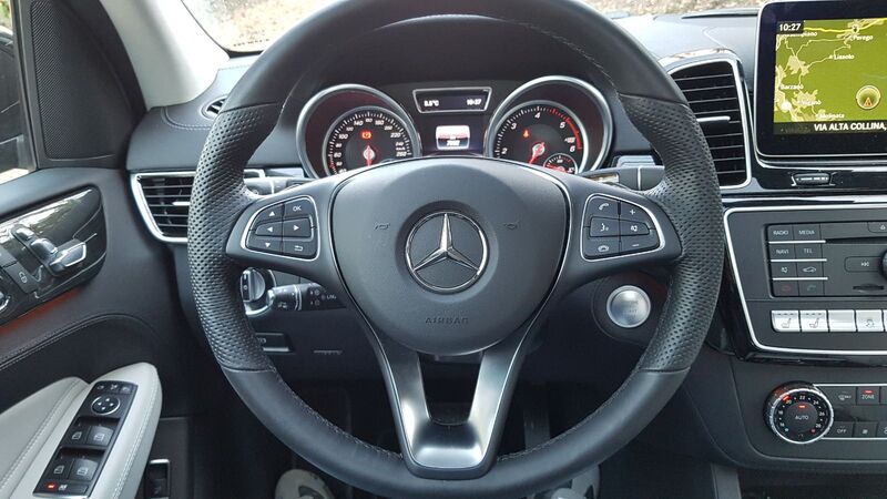 Il cambio 9g tronic plus è intelligente e non ha alcun problema da segnalare, lo sterzo non si indurisce mai tantissimo e si declina su un volante da imparare a usare per interagire al meglio con le tante funzioni a disposizione. La personalizzazione è un punto di forza di questa Mercedes GLE; non parliamo degli elenchi chilometrici di optional, ma delle modalità di guida che possono trasformare anche le cambiate, accorciandole o allungandole. C'è di buono che in nona a 110 si gira intorno ai 1200 giri, con un conseguente risparmio in termini di dispendio di carburante.