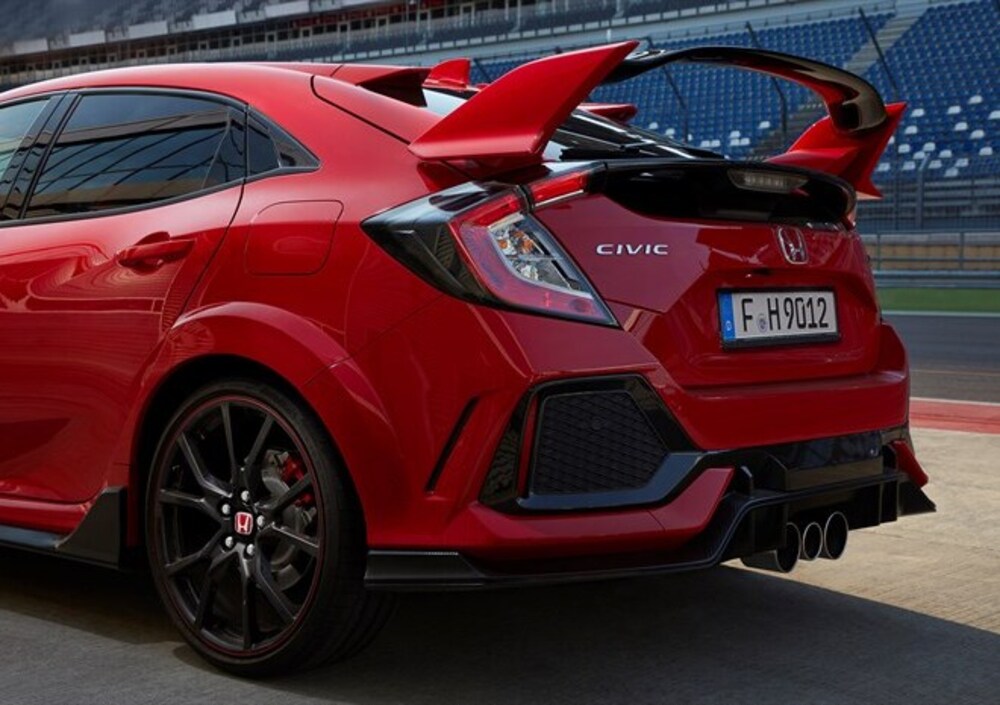 Sempre un pochino “spaziale” ma soprattutto più aerodinamica e bassa (di 36mm) oltre che muscolosa, rispetto alla precedente Civic Type R del 2015, questa nuova Type-R vista da vicino sfoggia elementi non comuni, per le strade di tutti i giorni. Come i profili aerodinamici nella parte bassa, per convogliare i flussi, con tanto di pinne e materiali pregiati. Qualche altra auto nel segmento, rifinisce lo stile di base per l’aerodinamica, qualcuna addirittura lo corregge per estetica, qui è invece come in gara, come una vera Honda: quanto si veda nasce in primis per ottimizzare o il flusso o il raffreddamento, a partire dalla feritoia nel cofano (in alluminio) che punta verso il motore. Le molte griglie nere non sono solo estetiche, ma con uso di raffreddamento necessario per quanto di spinto vi sia sotto la carrozzeria. Oltre quanto si vede, già noto, come la H rossa, è anche nelle parti nascoste che i tecnici giapponesi hanno lavorato, quelle parti dove solo chi conosca le competizioni in pista mette normalmente mano e dove un cliente attento come quello di una vera Type R, percepisce di avere qualcosa che lo gratifichi nel DNA originario, non per modifiche successive. Cerchi quasi esagerati, 20’’ con gommatura Continental dedicata e pinze Brembo in bella vista, a quattro pistoncini anteriormente. Da ogni punto di vista si guardi, la Civic Type R 2017 non colpisce tanto per le sue proporzioni, certo personali, né per un esagerato pregio di finiture, comunque buone, ma più semplicemente per come vi siano elementi utili alla prestazione che vanno oltre la sola grinta. Ricordando come Honda abbia la sportività nel DNA di questi modelli partendo proprio da quei mitici anni Novanta, dove vinceva in F1 con McLaren e un certo Ayrton da San Paolo, che premeva il pedale destro a fondo. Ecco allora che un cultore della sportività in questo segmento, non potrà affermare che è un’auto troppo poco raffinata, neppure davvero “tamarra”, perché il suo aspetto, come da filosofia corsaiola, è figlio del necessario per andare forte, niente di più, né di meno (infatti sono sedici i Kg risparmiati dalla precedente edizione, per la scocca). L’infinita serie di profili e pinne, in tinta o in carbonio, che quando si arriva al posteriore lasciano ancor più cattiveria visibile, con quei tre scarichi e il parecchio voluminoso alettone coordinato con i sei deflettori posti sul tetto, sono tutti necessari per fare andare la Civic Type R come deve.