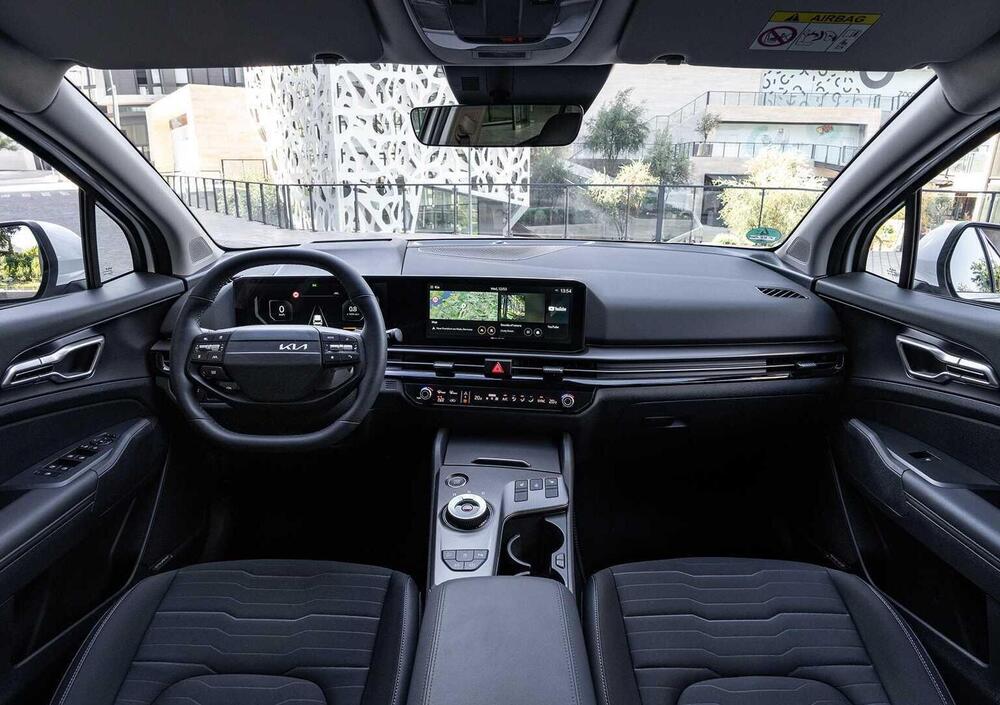 L'abitacolo della nuova Sportage rappresenta forse il cambiamento più significativo rispetto alla generazione precedente. Il Connected Car Navigation Cockpit domina la plancia con i suoi doppi display curvi che mantengono le dimensioni della versione precedente da 12,3 pollici, affiancati da un nuovo head-up display da 10 pollici.