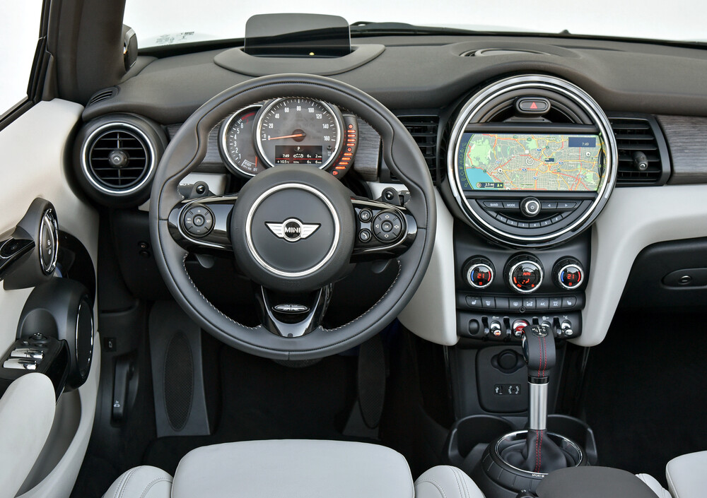 Gli interni, studiati per ospitare sino a quattro persone, vantano tutte le novità tecnologiche introdotte con la nuova Mini a partire dalle personalizzazioni in legno o pelle oltre che il sistema multimediale Professional (di derivazione BMW) con schermo da 8,8" e funzioni dedicate all'utilizzo cabrio della vettura (2.150 euro): tra le varie si fanno notare la lettura del meteo, con tanto di avviso via app al proprietario in caso di arrivo della pioggia (10 minuti, utile se si è parcheggiato la vettura aperta) o il conteggio dei minuti in cui la vettura ha viaggiato scoperta, elemento comunque già presente anche sulla terza generazione.