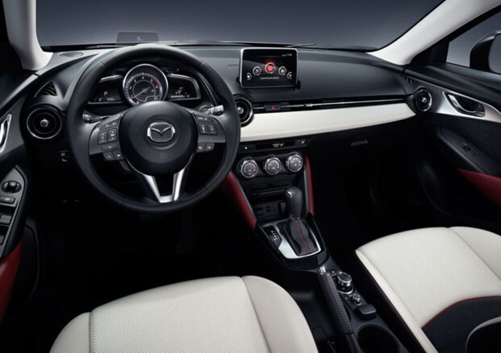 CX-3 ***. Se vista da fuori non pare certo troppo pacata, anche al volante la Mazda CX-3 esprime un discreto vigore. Non che sia una vera corsaiola, i numeri parlano chiaro, ma nel segmento si distingue per buona solidità delle sospensioni e guida diretta, oltre che sicura quando serva. Merito di massa contenuta e sistemi efficienti, come la frenata di emergenza (fino a 30 Km/h). Sono presenti assistenze in frenata e in salita, utile anche per fuoristrada, mentre lo sterzo è supportato con variazione graduale in funzione delle circostanze. Con un passo di 2,57 metri, peso a vuoto 1275 Kg. il quattro cilindri 1.5 Euro6 da 105 CV fa condurre abbastanza agilmente la CX-3 a giri medi e bassi (ha coppia massima, 270 Nm, tra 1600 e 2500 giri, raggiugendo piena potenza a 4000 giri). Buona la ripresa, per un 1.5, con il classico 0-100 Km/h in soli 10,5 secondi, mentre la velocità massima si attesta ai 173 km/h. Poco meno prestante della Vitara nei valori assoluti e ai giri alti, ma non certo auto che da reazioni poi lente o troppo morbide, rimanendo sufficientemente confortevole in città. La trasmissione a gestione elettronica, derivata dalla sorella maggiore CX-5 e ricca di sensori (ben 27), diviene integrale autonomamente, con il supporto delle ruote posteriori qualora serva in caso di perdita aderenza sulle anteriori. I sei rapporti del cambio si gestiscono in modo semplice, mai in crisi anche se non si presti tutta la cura necessaria, con una leva che risponde sempre bene eseguendo gli innesti. Si possono giusto rilevare guidando, un po’ di rumorosità ai giri più elevati e la visibilità posteriore limitata non poco, come per molte vetture con questo taglio estetico: ci si ovvia con le assistenze per il parcheggio e con l’abitudine, che non guasta anche per il fronte alto della parte anteriore.