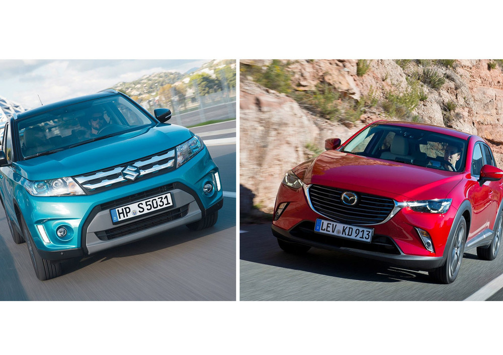 Confrontiamo due modelli di auto appartenenti a quello che si definisce oggi segmento B-SUV. Veicoli abbastanza compatti longitudinalmente, poco oltre i quattro metri, ma ricchi di spunti interessanti per la praticità che regalano sia nello spazio, almeno per due adulti e medio carico, sia nella guida, capace di affrontare manti non asfaltati. Considerando chi non abbia necessità derivanti da famiglie numerose, gradendo però auto più alte e solide delle normali berline o due volumi, con discrete percorrenze annue magari anche su qualche sentiero, o passaggio montuoso, confrontiamo: Mazda CX-3 1.5 D AWD Exceed e Suzuki Vitara 1.6 DDiS 4WD Allgrip V-top. I listini delle due Best Seller europee per entrambe le Case, aprono rispettivamente a euro 19.320 (Mazda) e 20.200 (Suzuki) per le versioni due ruote motrici benzina, qui si considerano invece le varianti a gasolio 4x4 più dotate, di allestimento top, comunque a listino sotto i trentamila euro (8/2016).