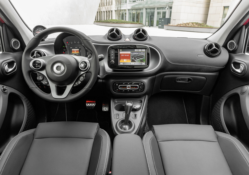 Gli interni sono ovviamente premium nel contesto del segmento A: oltre alla profusione di pelle è disponibile anche il sistema multimediale con schermo touch da 7" e comandi vocali con funzionalità Mirrorlink. Per la Fortwo (lunga 2.69 come la precedente) è come sempre disponibile anche la versione Cabriolet con capote in tela e lunotto in cristallo: si apre e si chiude in 12 secondi anche alla massima velocità.