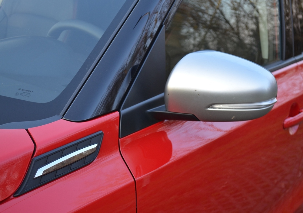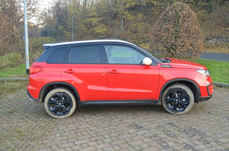 Rispetto a Suzuki Vitara, la S acquista alcuni particolari di design che colpiscono già al primo impatto. Specialmente nella colorazione rossa, che si accompagna a quella beige e quella grigia, tutte abbinate al tetto nero, si percepisce come il produttore giapponese abbia voluto avvicinarsi a quella clientela che non lascia nulla al caso, nemmeno la nuance dei cerchi, da 17 pollici qui, che si vestono di nero. Il frontale di Suzuki Vitara S mostra la calandra a cinque scomparti, e gruppi ottici dove gli anabbaglianti sono a LED, nel solito abbinamento discutibile di luce calda-fredda con gli abbaglianti alogeni. Intrigano, invece, il particolare rosso nel gruppo ottico, e le modanature nere del paraurti, che circondano le luci diurne a LED e i fendinebbia. Anche dietro Suzuki Vitara S presenta alcune differenze: lo spoiler nero, per esempio, si accompagna all’estrattore satinato, e satinati sono anche gli specchietti retrovisori. L’insieme risulta armonioso, tanto che a un occhio poco attento o nello sguardo di un attimo, Suzuki Vitara S ricorda vagamente Range Rover Evoque. Suzuki Vitara S, al pari di Suzuki Vitara, è un fuoristrada snello da meno di quattro metri e venti di lunghezza per un metro e sessantuno di altezza e quasi uno e ottanta di larghezza. Pesa quasi tredici quintali, che declinati nell’uso in fuoristrada si traducono in grande maneggevolezza e possibilità di cavarsi di impaccio in ogni occasione, merito pure della trazione integrale permanente.