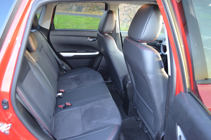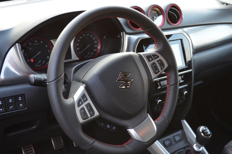 I particolari rossi degli esterni sono traghettati dai designer Suzuki anche all’interno: elementi della plancia come le bocchette dell’aria (dal disegno vintage, va sottolineato) e come l’orologio sono circondati di rosso, e rosse sono pure le cuciture del volante e dei sedili, riscaldabili a due potenze, che mischiano pelle e microfibra. La plancia richiama gli specchietti satinati con una superficie che si inserisce orizzontalmente tra le plastiche per altro solo essenziali inserite su Suzuki Vitara S. Il centro della plancia è occupato dal display toucscreen da sette pollici a tecnologia capacitiva che ospita il sistema infotainment di cui parleremo in un focus a parte, mentre la parte inferiore vede la presenza del climatizzatore monozona, un’unità capace di riscaldare in fretta l’abitacolo, ma che non prevede bocchette posteriori per il divano a tre posti. La posizione di guida è naturalmente elevata rispetto al normale, anche se non siamo staccati da terra in misura abbondante. Anche i driver extralarge non avranno problemi con la testa e le ginocchia, se non per il disegno del tunnel centrale, che sotto al climatizzatore lascia un angolo smussato (ma pur sempre un angolo) contro cui il ginocchio destro rischia di sbattere spesso. Il divano posteriore, con un driver extralarge, perde naturalmente comodità, ma in generale riusciamo a stipare tre persone non abbondanti se chi guida non supera il metro e ottanta. Il bagagliaio ha un’altezza di carico abbastanza elevata, ma il piano è unico e ci consente di alloggiare fino a 375 litri di bagagli che diventano oltre 1100 con i sedili posteriori abbattuti. In più, vi è un pozzetto inferiore, o sottofondo, che consente di nascondere gli oggetti preziosi. Completano il bagagliaio due tasche lateali, la luce di cortesia, e la presa 12V.