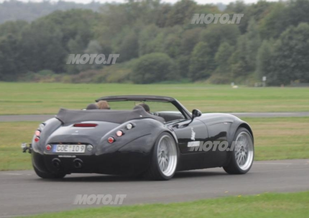 L’accensione del motore viene comandata dalla rotazione di una chiave di stampo tradizionale permettendo al sound del V8 tedesco di pervadere con vigore l’abitacolo fin dai bassi regimi. Basta una lieve pressione sul pedale del gas però per trasformare un suono cupo dalla tonalità bassa in un ruggito entusiasmante, che cresce con il salire del contagiri mentre la forza trasmessa dal propulsore BMW inizia a farci lievemente defluire il sangue dal cervello quando iniziamo a scaricare al suolo sulle ruote posteriori i 420 CV della Wiesmann GT MF4-S con cui iniziamo a percorrere il primo dei nostri due passaggi lanciati sulla pista di decollo dell’aeroporto di Borkenberge.