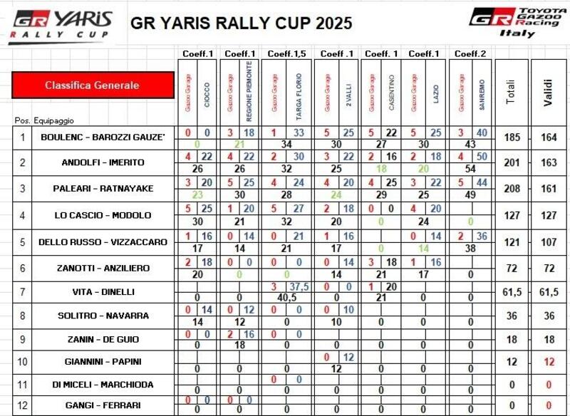 Rally Due Valli: 1. Boulenc-Barozzi Gauze (Toyota Yaris Gr) in 1:10'41.9; 2. Andolfi-Imerito (Toyota Yaris Gr) a 56.2; 3. Paleari Henssler-Ratnayake (Toyota Yaris Gr) a 1'03.0; 4. Lo Cascio-Modolo (Toyota Yaris Gr) a 2'43.7; 5. Dello Russo-Lazzarini (Toyota Yaris Gr) a 2'45.1; 6. Zanotti-Vanzini (Toyota Yaris Gr) a 3'35.0; 7. Giannini-Papini (Toyota Yaris Gr) a 3'51.1; 8. Solitro-Navarra (Toyota Yaris Gr) a 7'26.2...