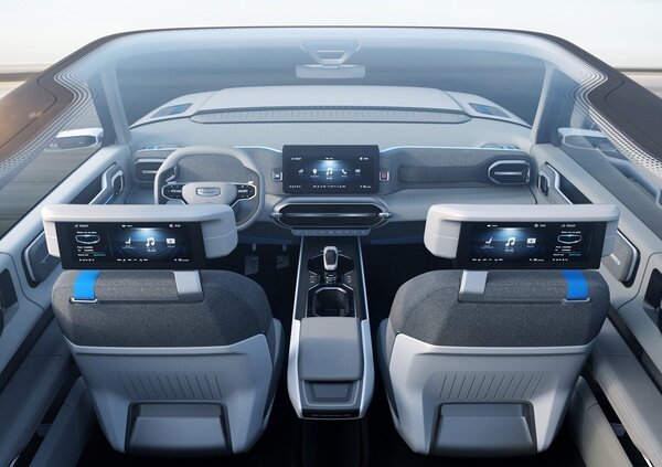 Gli interni sono ancora più estremi: doppio display per la plancia frontale e sedili squadrati con la cintura incorporata. Inoltre, sul poggiatesta delle sedute anteriori è presente uno schermo per i passeggeri. Non manca il tetto completamente trasparente per allargare gli spazi. Semplice gioco di stile o un’anticipazione dei progetti del Marchio?